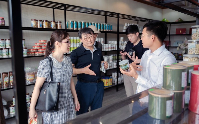 | Du khách nước ngoài tìm hiểu sản phẩm của Hợp tác xã nông nghiệp Sen Quê Bác. |