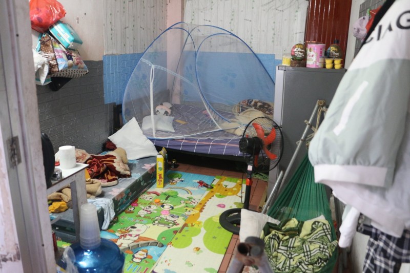 Đông người, nhu cầu sử dụng lớn nhưng phòng của anh Loan chỉ kê đủ một chiếc giường, tủ lạnh và vài vật dụng cá nhân nhỏ để chừa lại lối đi. Khu vực nấu ăn cũng nằm ngay trong phòng. Mặc dù có con nhỏ nhưng hoàn cảnh hiện tại chưa cho phép thuê chỗ rộng rãi hơn nên gia đình vẫn tá túc tại đây.