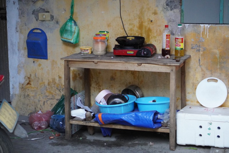 | Diện tích chật hẹp nên nhiều công nhân phải kê bếp ở bên ngoài. |