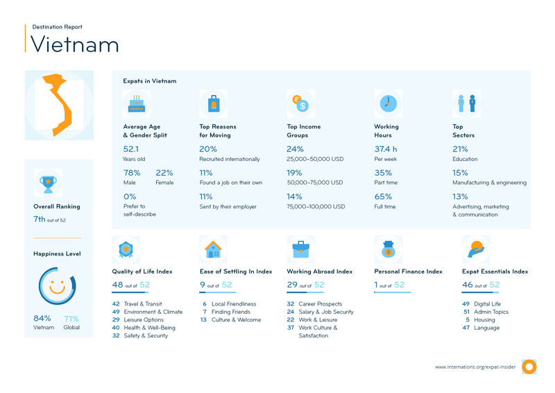 | Kết quả khảo sát Expat Insider cho thấy Việt Nam đứng thứ 7 trong số 52 quốc gia và vùng lãnh thổ là điểm đến tốt nhất cho người nước ngoài. (Nguồn: InterNations) |