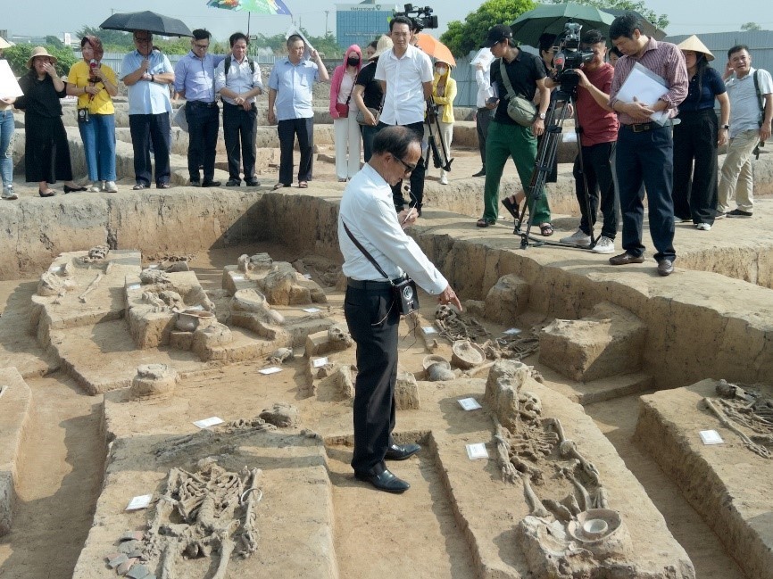 | PGS.TS Nguyễn Lân Cường giới thiệu về các mộ táng tại di chỉ khảo cổ Vườn Chuối - Ảnh: Bảo tàng HN. |