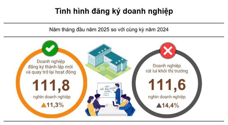 Riêng tháng 5, cả nước có hơn 15,1 nghìn doanh nghiệp thành lập mới với số vốn đăng ký hơn 156,7 nghìn tỷ đồng và số lao động đăng ký là 98,1 nghìn lao động, giảm 0,6% về số doanh nghiệp, tăng 17,3% về số vốn đăng ký và giảm 23,1% về số lao động so với tháng 4/2025.