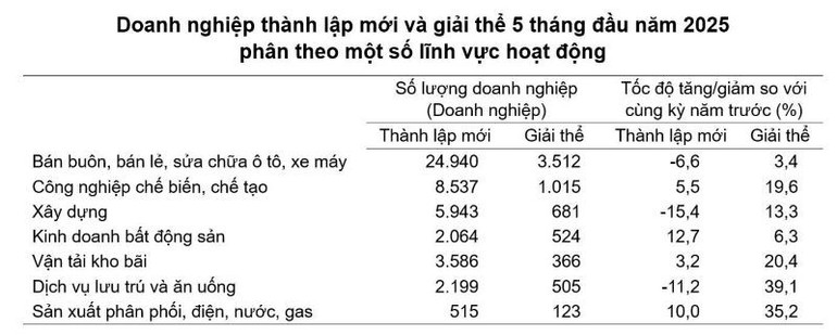 Theo khu vực kinh tế, trong 5 tháng đầu năm 2025 có 627 doanh nghiệp đăng ký thành lập mới thuộc khu vực nông, lâm nghiệp và thuỷ sản, giảm 1,7% so với cùng kỳ; hơn 15,2 nghìn doanh nghiệp thuộc khu vực công nghiệp và xây dựng, giảm 3,9%; gần 50,9 nghìn doanh nghiệp thuộc khu vực dịch vụ, tăng 2%.