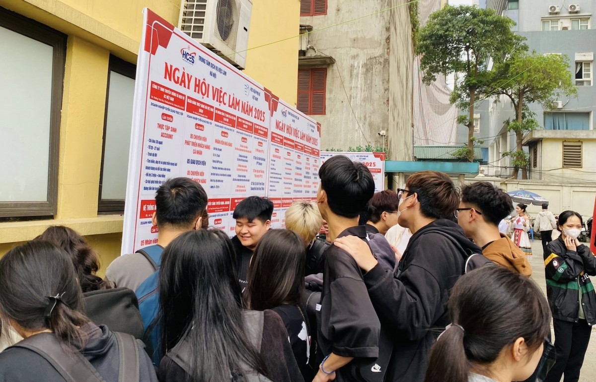 | Các bạn trẻ tìm hiểu cơ hội việc làm tại Phiên giao dịch việc làm do Trung tâm Dịch vụ việc làm Hà Nội phối hợp tổ chức. (Ảnh: B.Duy) |