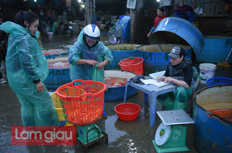 Từ 3 giờ sáng, hàng trăm tiểu thương các chợ lớn nhỏ trên địa bàn thành phố đã về đây mua cá. Không khí nhộn nhịp tại chợ cá Yên Sở trước ngày cúng ông Công, ông Táo.