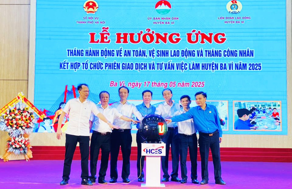 | Lãnh đạo Thành phố, huyện Ba Vì nhấn nút khai mạc Phiên giao dịch và tư vấn việc làm huyện Ba Vì năm 2025. |