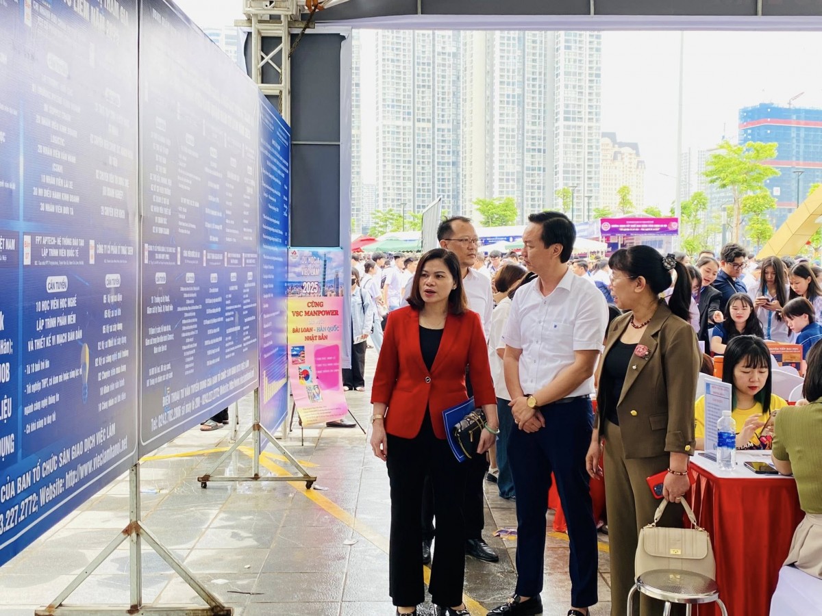 | Lãnh đạo Trung tâm Dịch vụ việc làm Hà Nội tham quan khu vực tuyển dụng tại Phiên giao dịch việc làm quận Nam Từ Liêm năm 2025. |