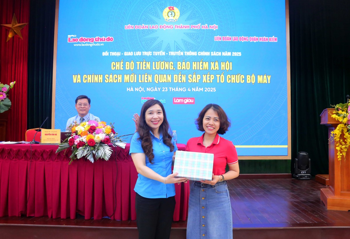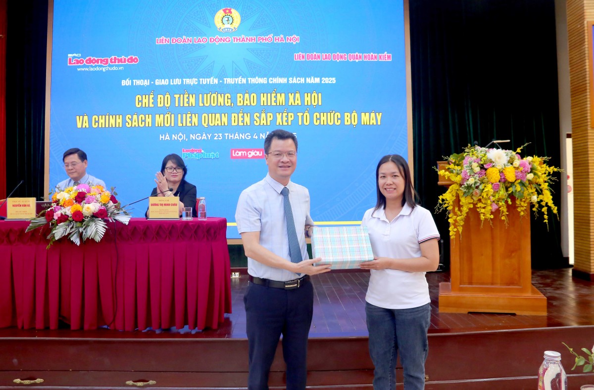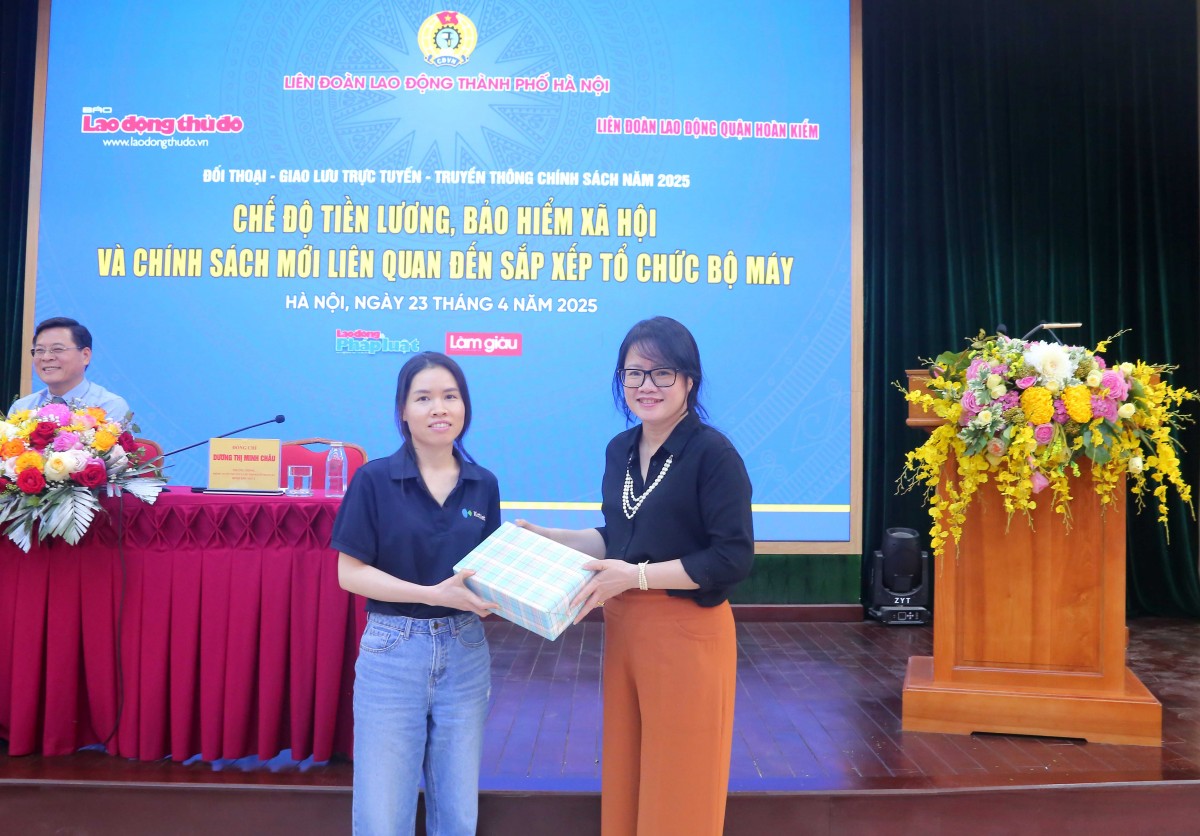 | Chủ tịch LĐLĐ quận Hoàn Kiếm Lê Hoàng Thủy Vân trao quà cho NLĐ tham gia phần trả lời câu hỏi giao lưu tại chương trình |