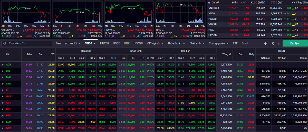 | Kết thúc phiên giao dịch ngày 21/6, VN-Index giảm 7,93 điểm (-0,67%) xuống 1.172,47 điểm |