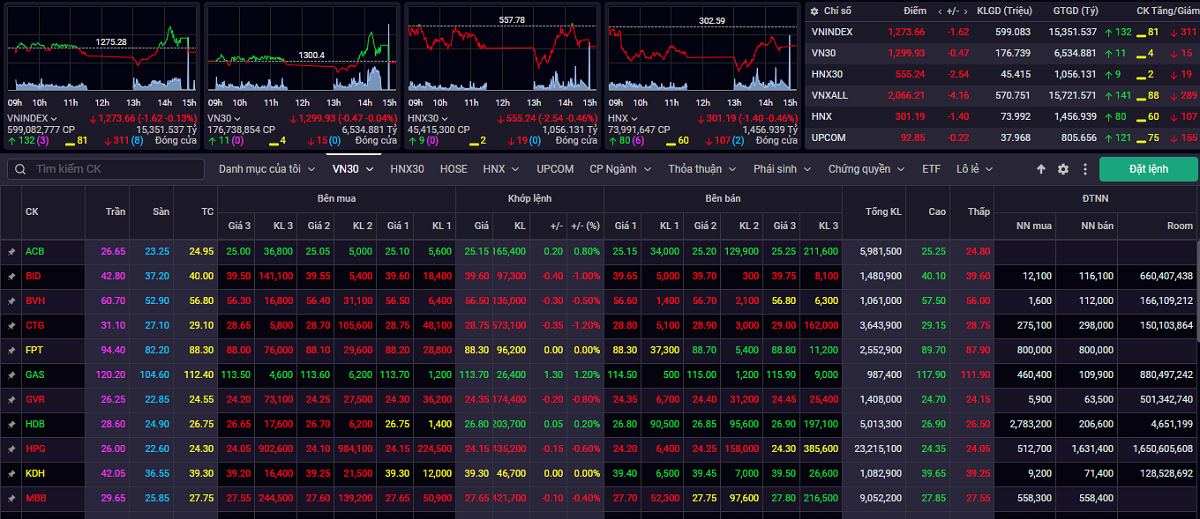 | Kết thúc phiên giao dịch ngày 18/8, VN-Index giảm 1,62 điểm (-0,13%) xuống 1.273,66 điểm. |